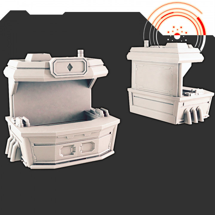 Bring the shady underbelly of your sci-fi world to life with Black Market Stall 1. This detailed market stall adds a touch of intrigue and atmosphere, perfect for clandestine deals and covert encounters on your tabletop.