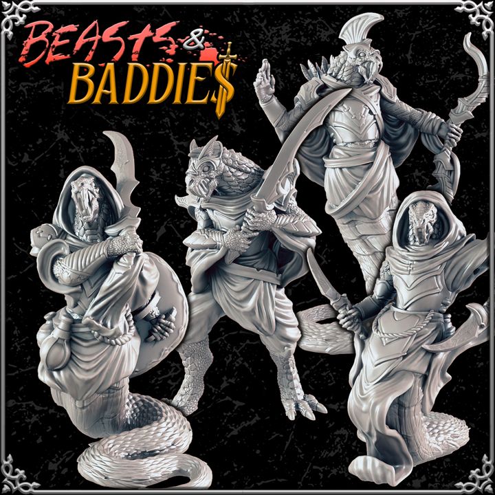Strike fear into your players with this detailed Snake People set. Featuring four serpent-like humanoid miniatures, these figures are perfect for encounters deep in the jungle, hidden temples, or ancient ruins in Dungeons & Dragons, Pathfinder, or any tabletop RPG.