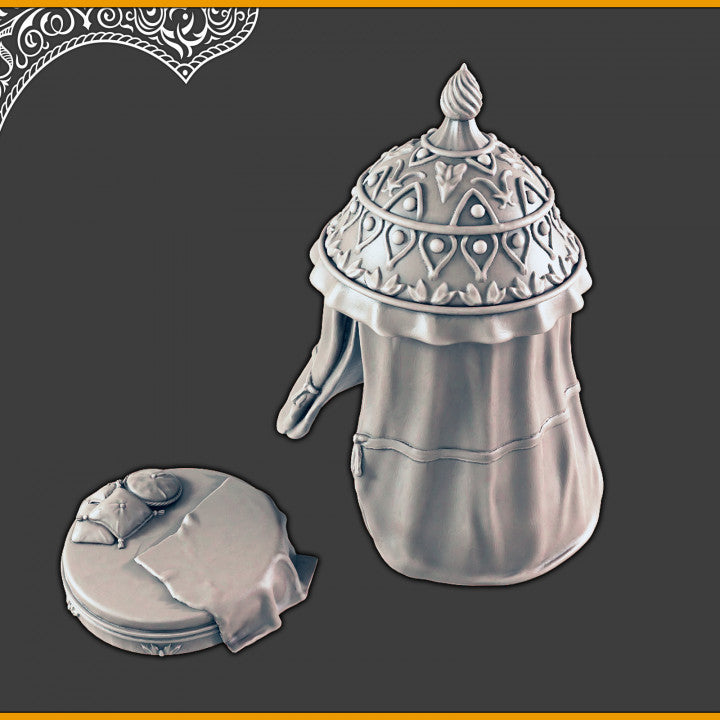 Add a touch of luxury to your palace interiors with the Sultan's Bed, a richly detailed 3D printed terrain piece perfect for desert-themed campaigns and opulent settings in Dungeons & Dragons or other fantasy RPGs.